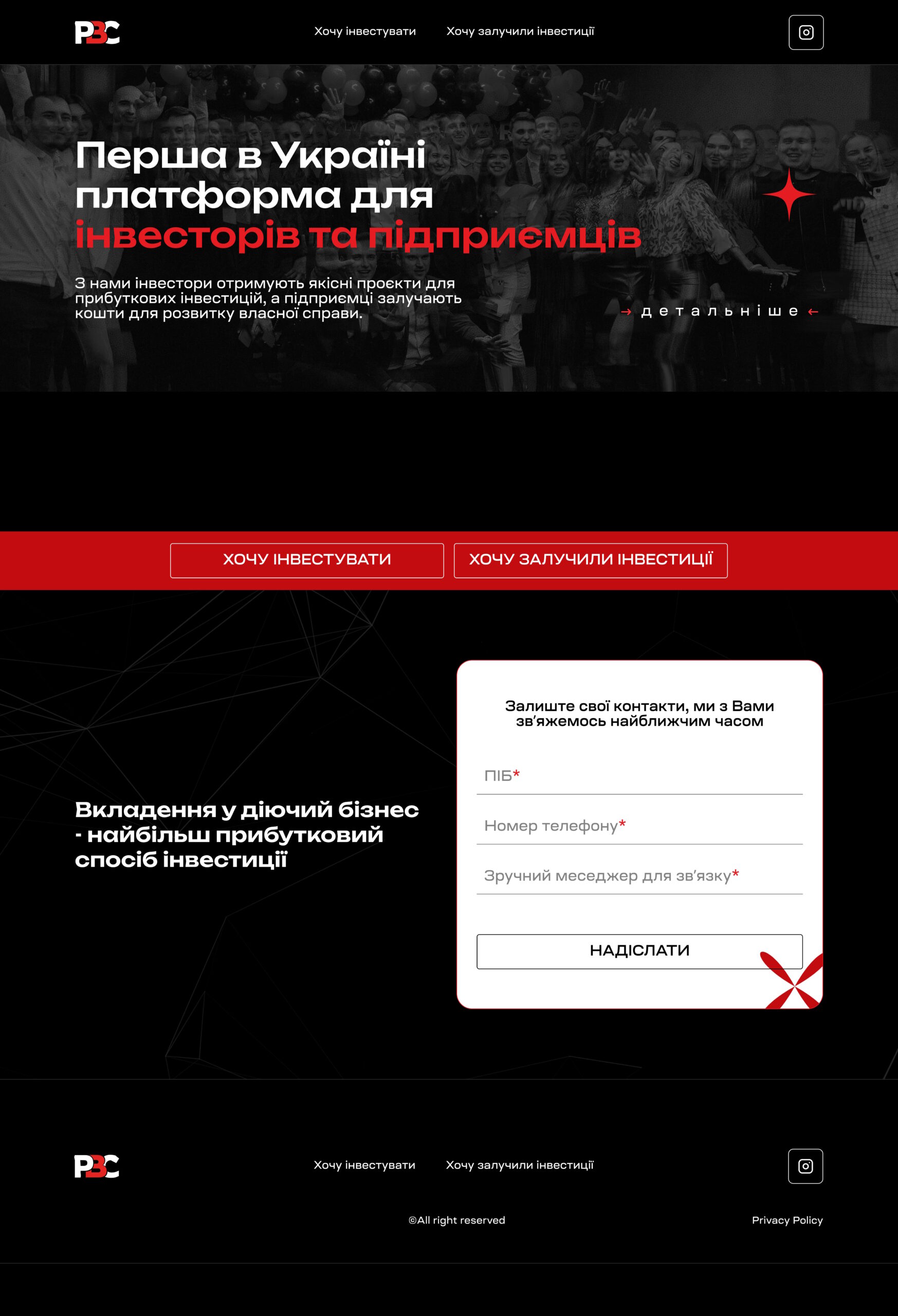 Розроблено сайт для першої в Україні онлайн-платформи, яка допомагає інвесторам знайти прибуткові проєкти, а підприємцям — залучити кошти для розвитку власної справи. Основний виклик — донести цінність платформи обом сторонам: інвесторам і бізнесам. Дизайн — контрастний, динамічний, у кольорах довіри та дії. Простий шлях до цільової дії через великі кнопки “Хочу інвестувати” / “Хочу залучити інвестиції”. Усе адаптовано для швидкого перегляду зі смартфона. Структура мінімалістична, але інформативна — фокус лише на головному.